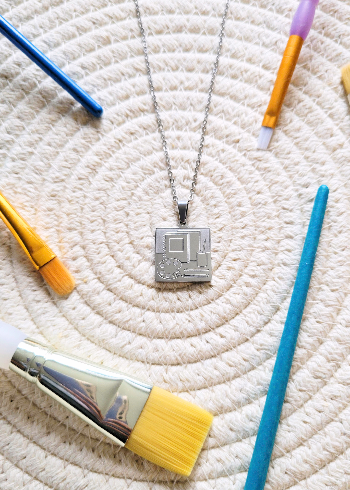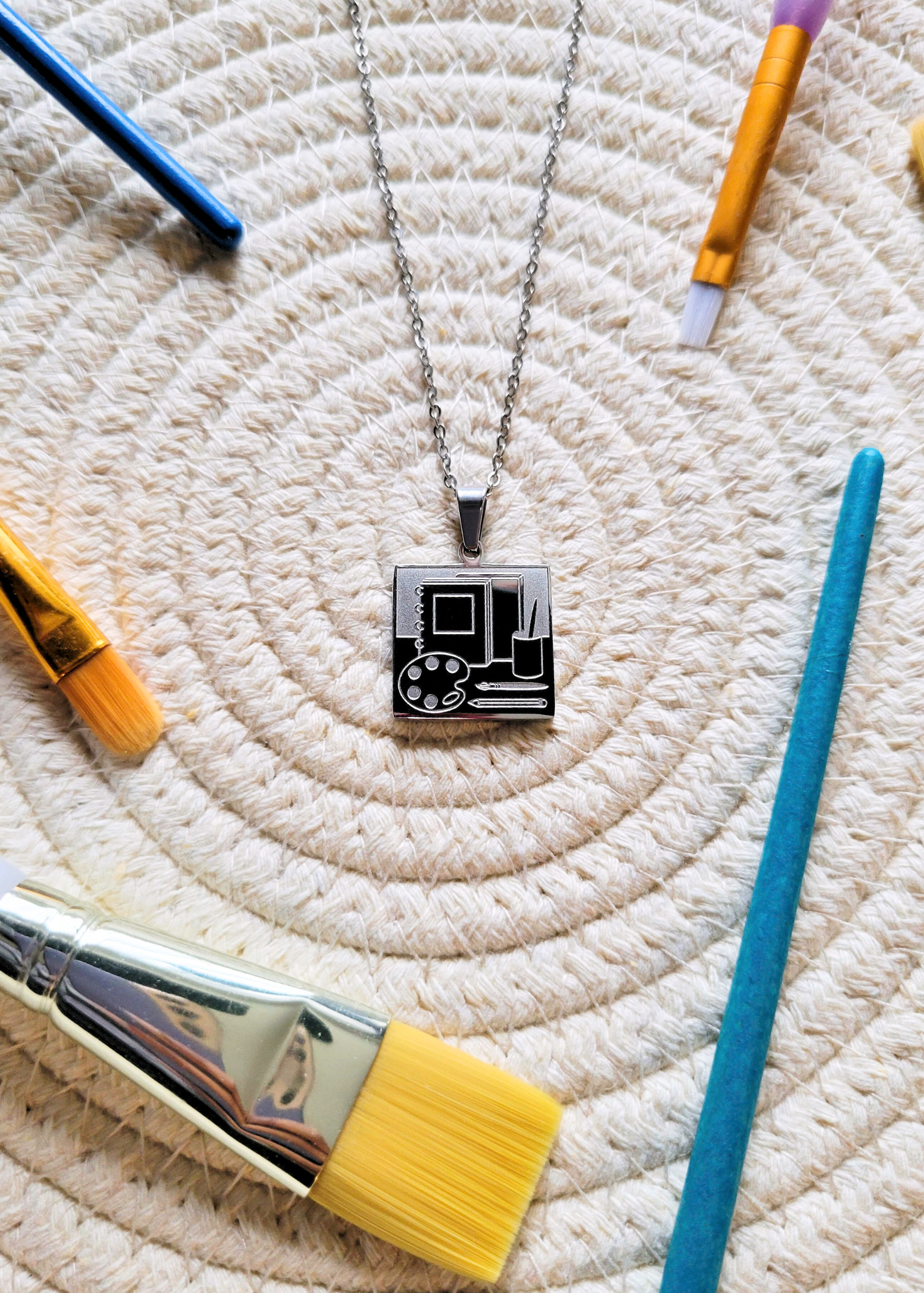 Front Design: Sketchbook, paintbrushes, paint palette, and artist items