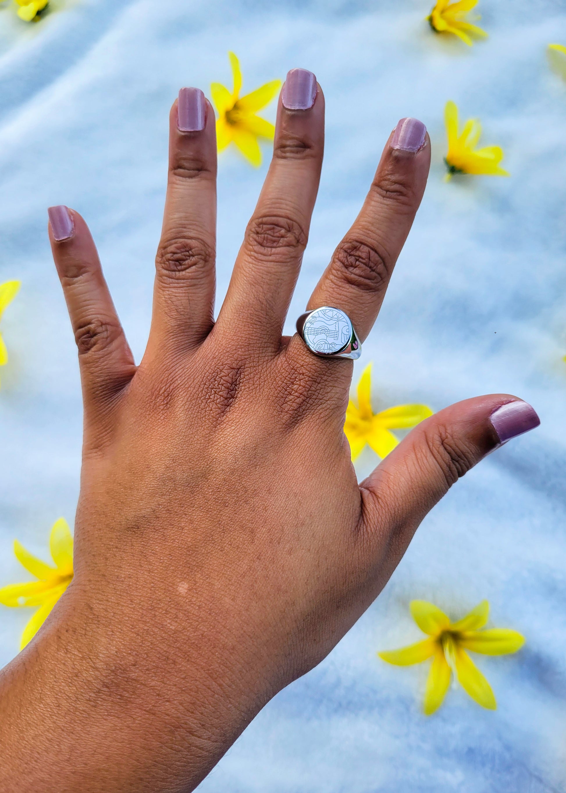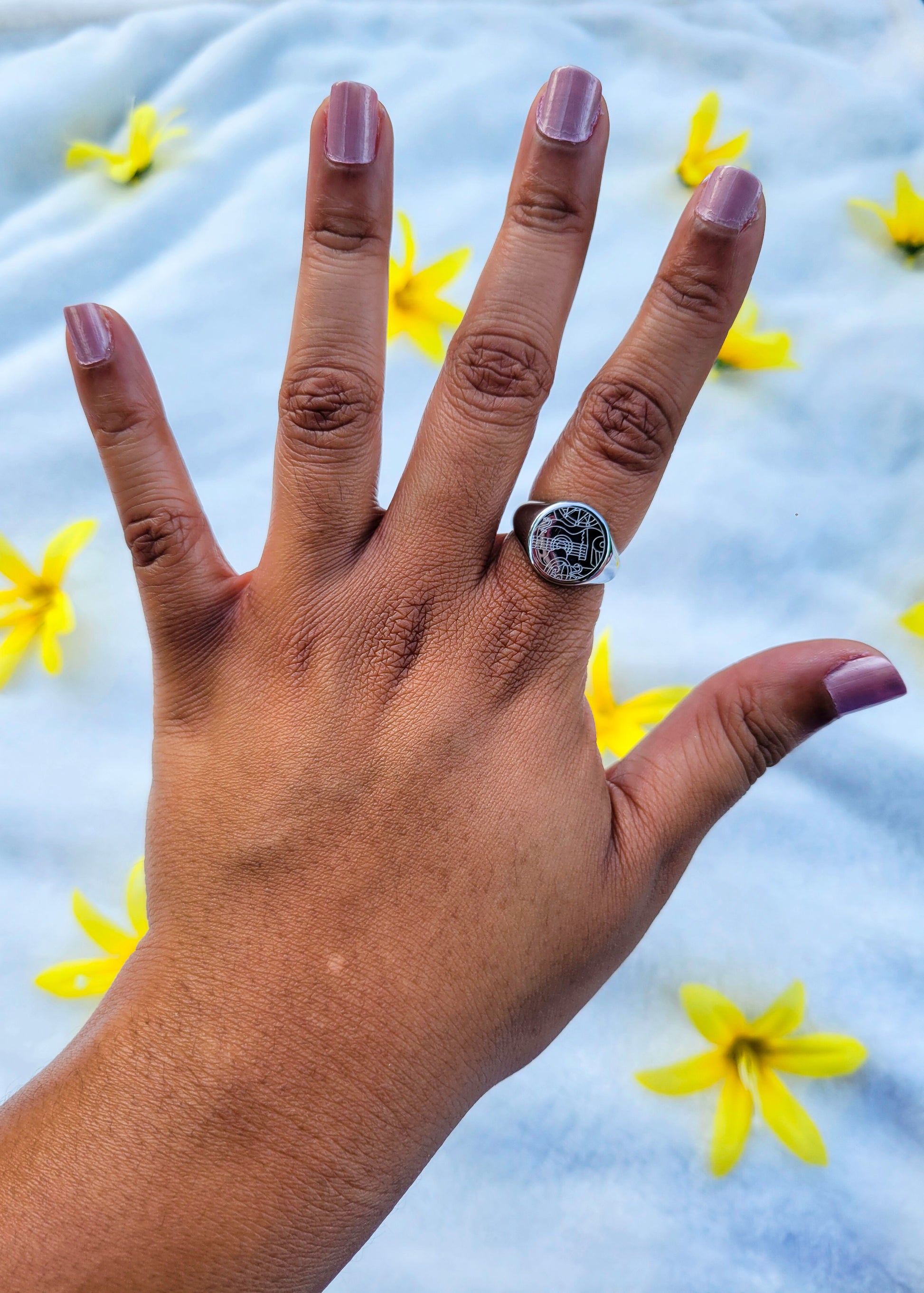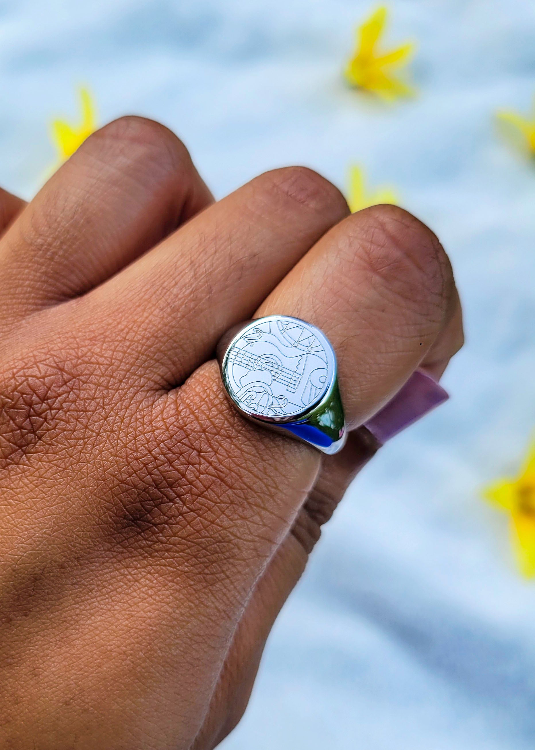This is a silver stainless steel ring engraved with a musical design I created!