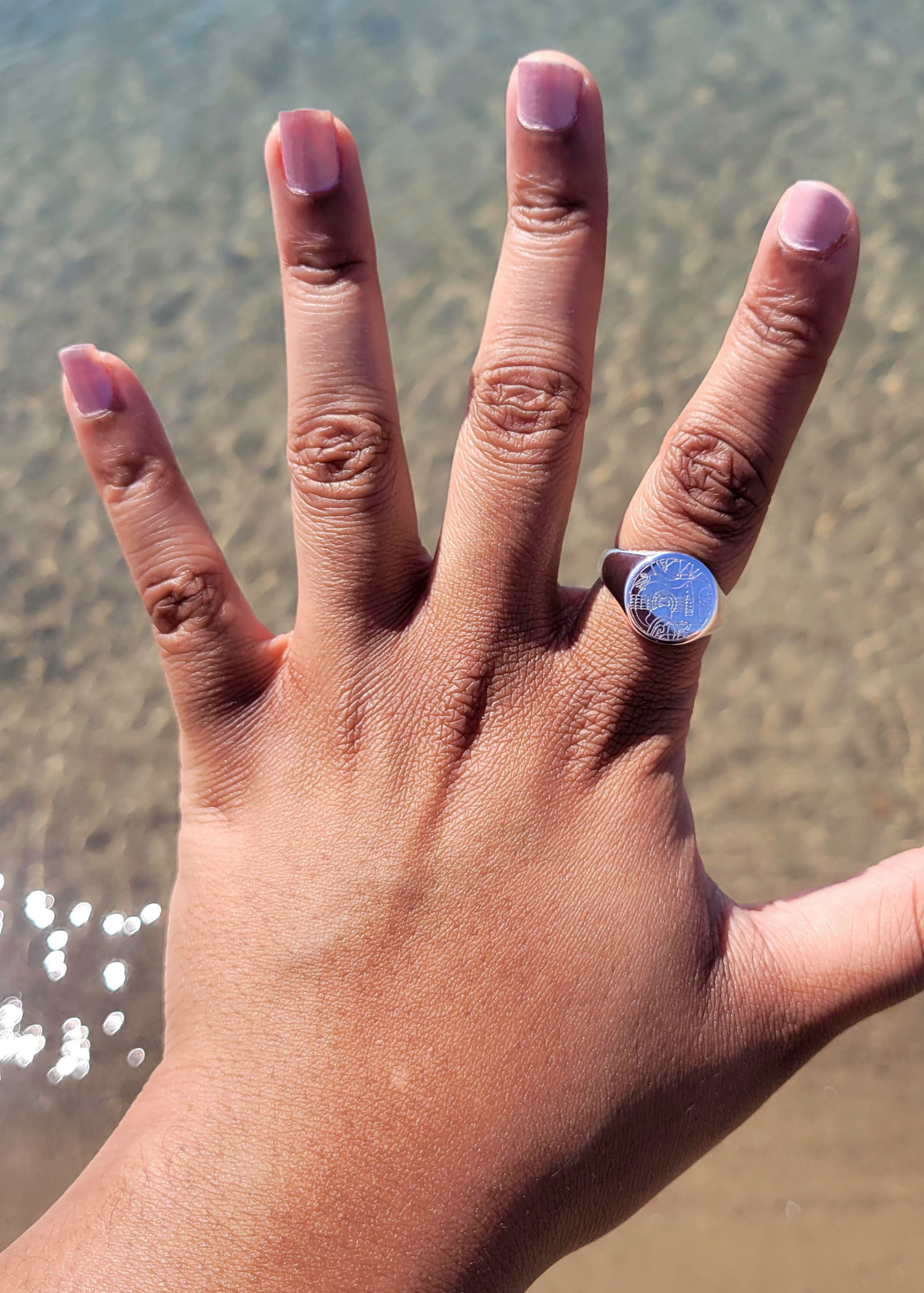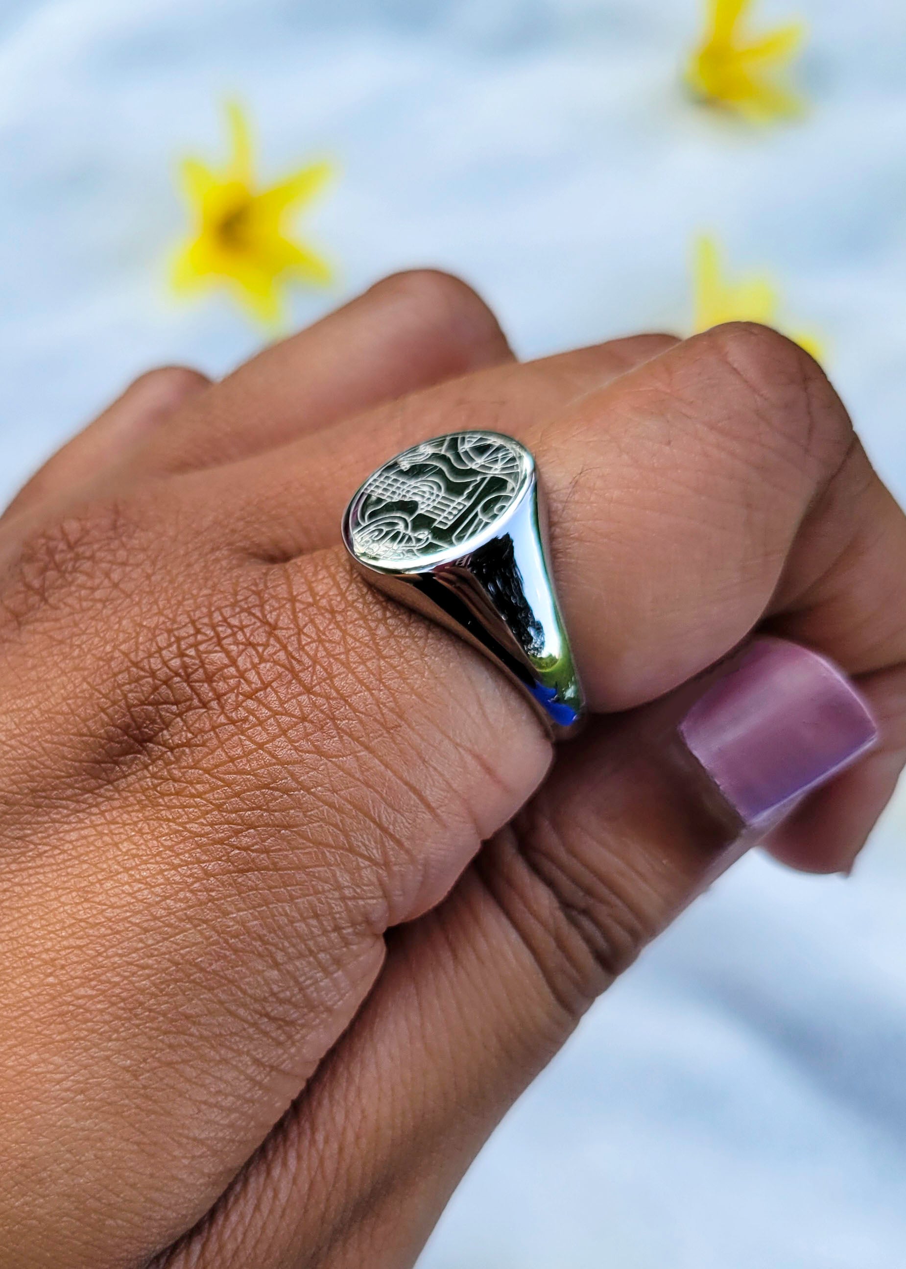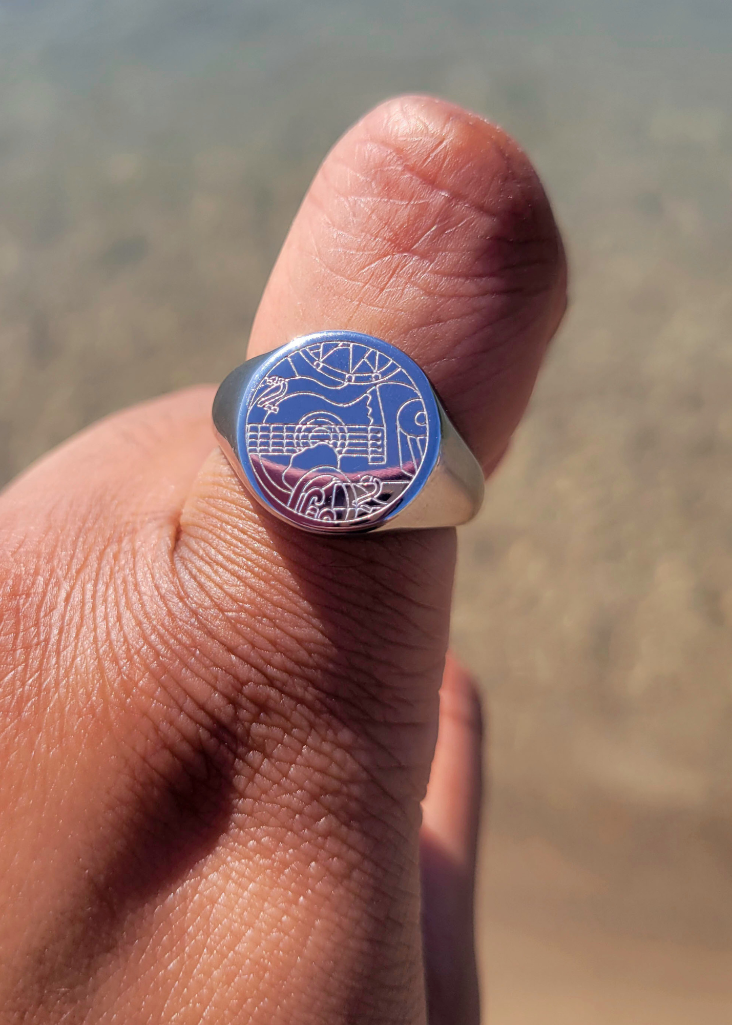 This is a silver stainless steel ring engraved with a musical design I created!